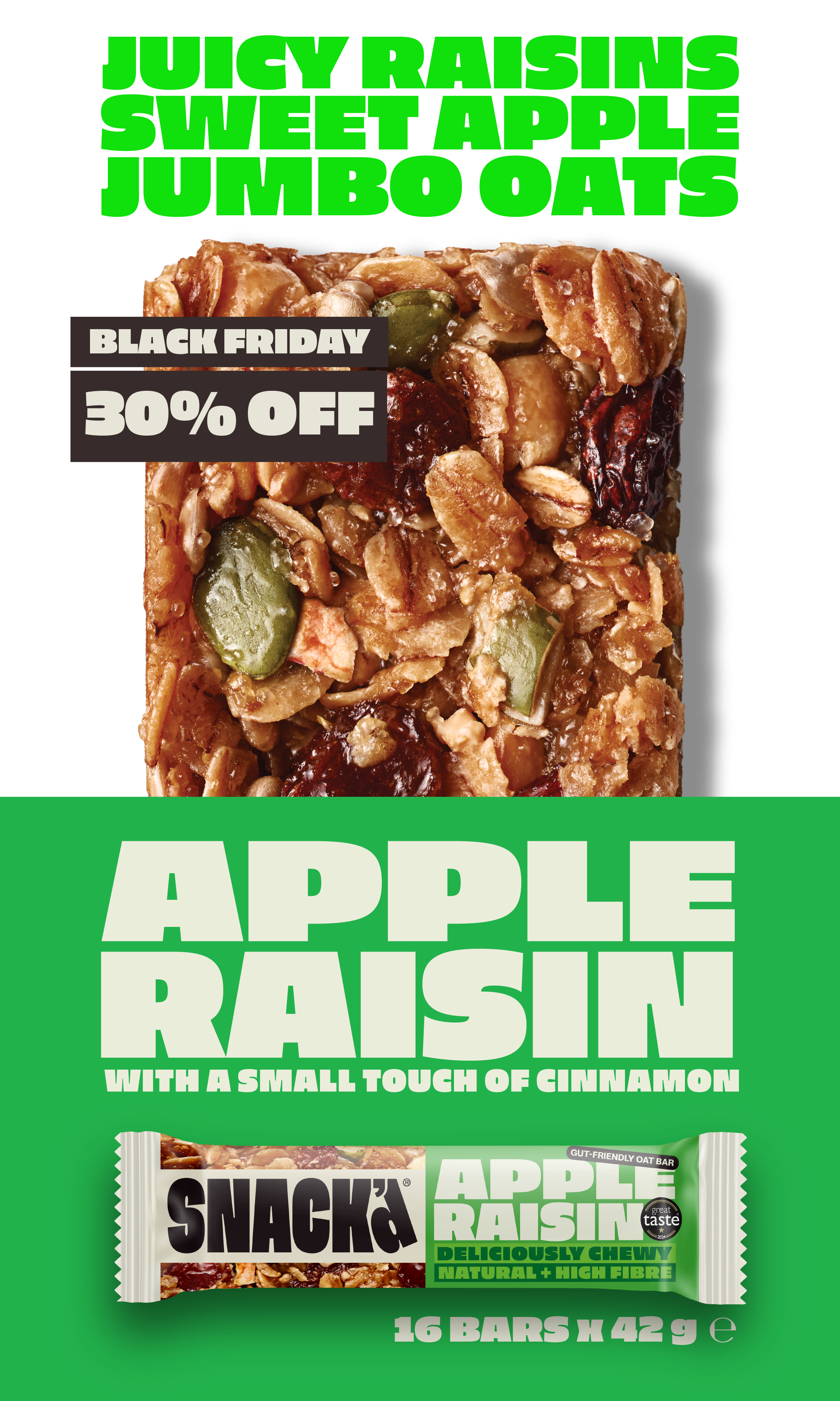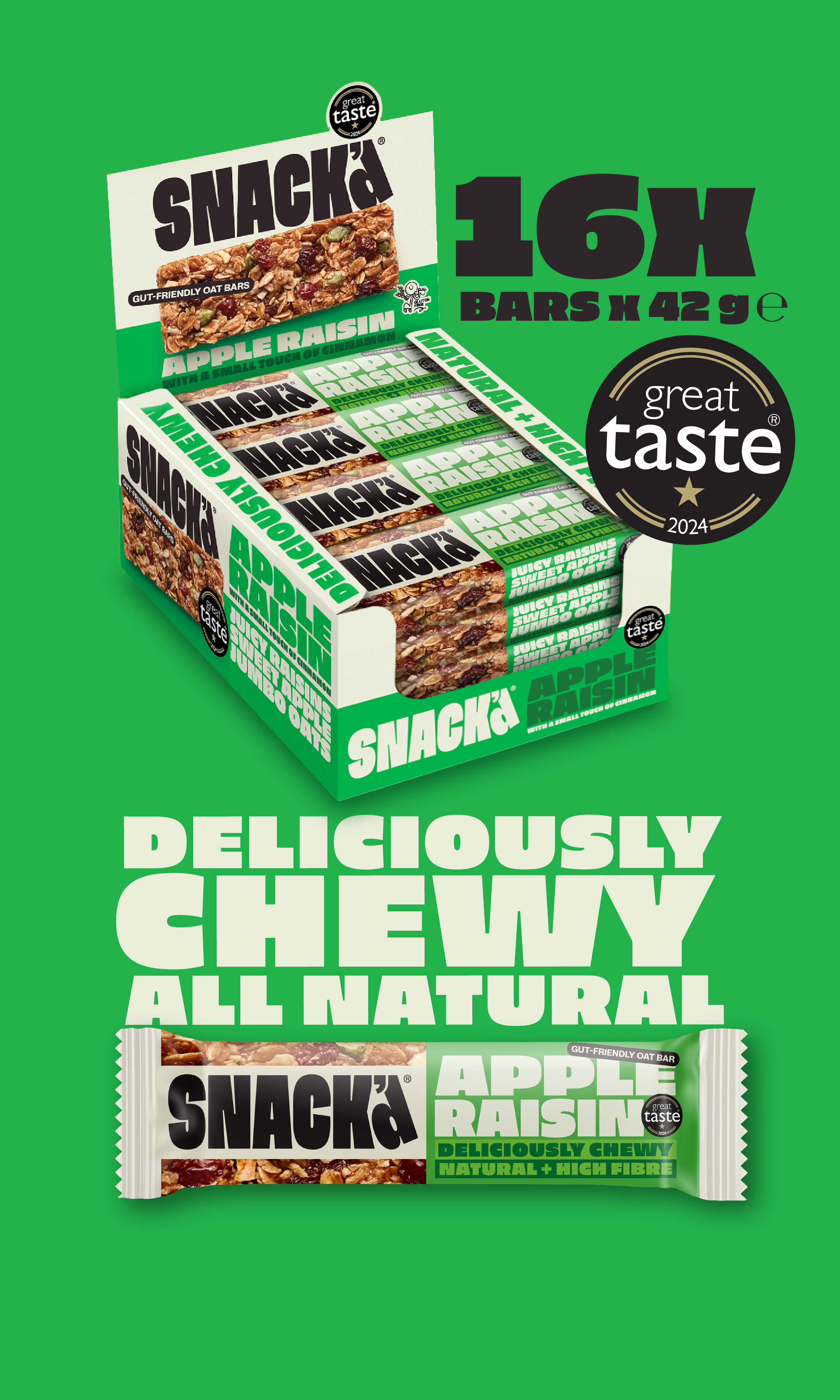SNACK'd Apple, Raisin & Cinnamon Bar – a naturally sweet, award-winning, gut-friendly snack made with jumbo oats, real apple pieces, juicy raisins, crunchy seeds, and a comforting dash of cinnamon.