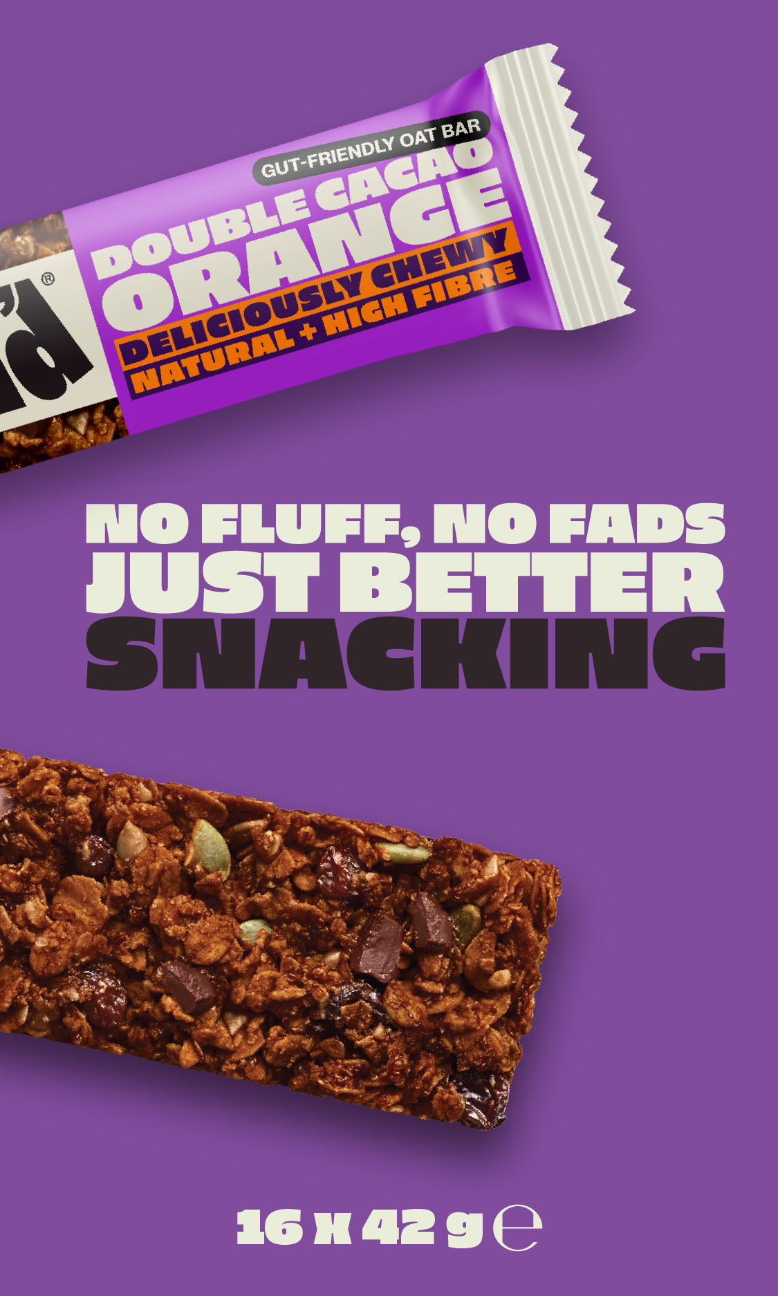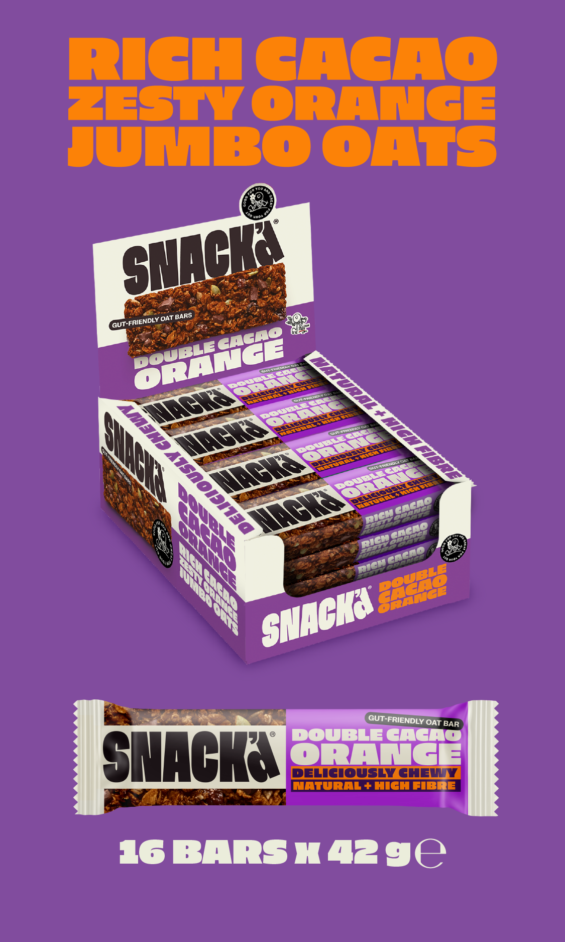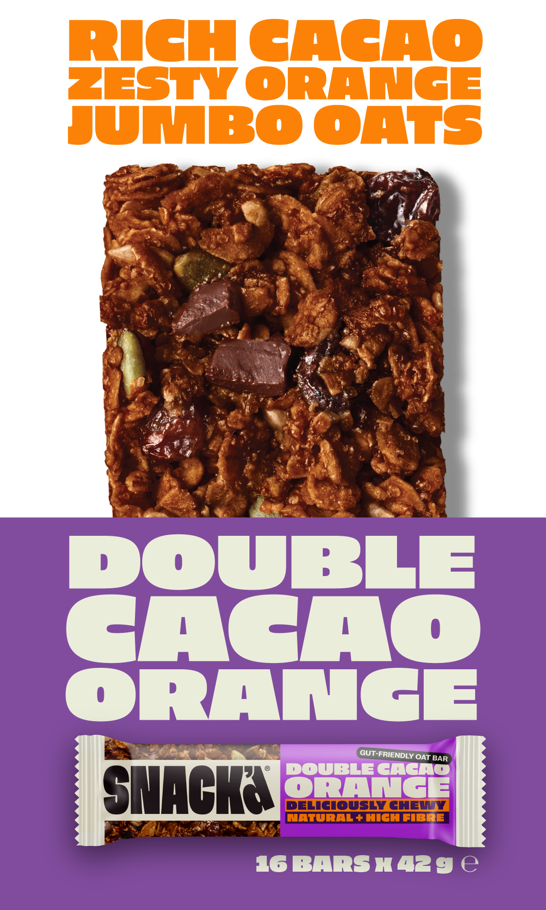 Indulge in the rich, chewy goodness of SNACK'd Oats Double Cacao & Orange, the award-winning oat bar that's as functional as it is flavorful. Bursting with real orange pieces and decadent double cacao, this 100% plant-based snack is crafted to support your gut health without compromising on taste.