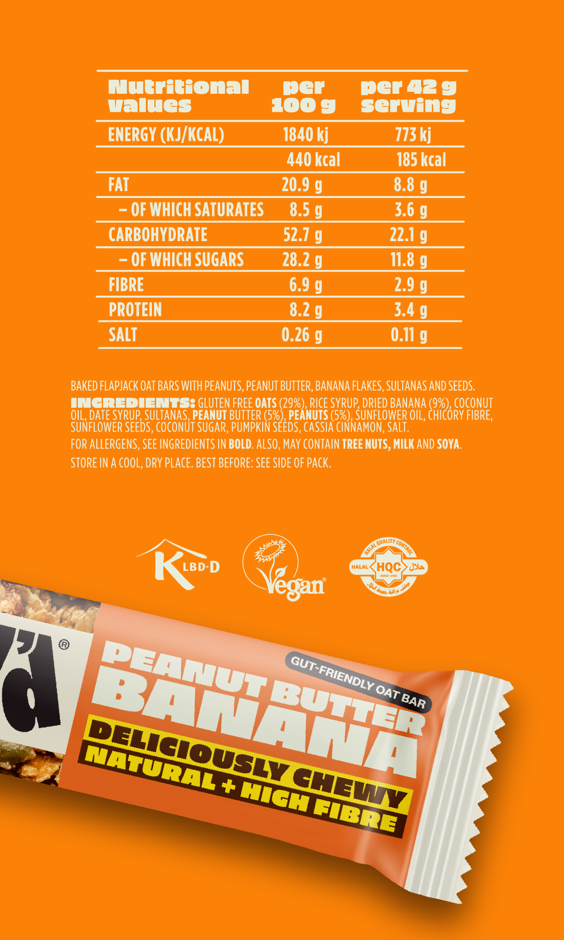 Enjoy the perfect balance of creamy peanut butter, sweet real banana, and crunchy seeds in this irresistibly chewy, gut-friendly oat bar. Made with jumbo oats, this bar delivers slow-release energy and real satisfaction — ideal for breakfast on the go, pre/post-workout fuel, or a healthy snack anytime you need it.